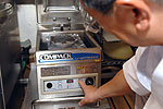 | “昆布で〆たらできあがり”と、言いたいが、まだ終わらないのが“こだわり”というもの。 鮮度を保つためにもう一工夫すると言う。 何と、真空状態にするのだ。“酸化を防止するには空気にさらさないことが一番”ということで、専用の装置で真空パックにしていく(左写真)。 スイッチ一つ押すだけで、あっという間にコハダの真空パックができあがり(右写真)!!1日置くとちょうど食べ頃だ。 艶やかな輝きは、できあがる前から食欲をそそられる。 こうして、コハダの仕込みは終了。 「コハダの大きさや身の締まり、気温、湿度によって、塩や酢の浸透具合は全然違う。気温によって塩の時間を変えたり、酢の温度に注意したりと、あらゆる面に気を配らなければならないんだよ。最近は、回転寿司店のネタも寿司店と変わらない味だと言う声が聞こえるけど、ここまで一つのネタに手間をかけているか、と言えば首をかしげざるを得ないね。」と、中村社長は言う。 様々な諸条件を踏まえて、常に同一の味を保つのはプロならではの技。 作業のプロセスが多いので、その分、職人さんの腕の違いが如実に現れるネタかもしれない。 美味しいコハダに仕上げるためには、長年培ってきた経験と技術、そしてコハダに対する愛情までもが必要なのである。 次ページへ |